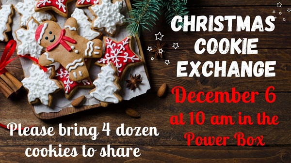 Cookies, Cookies, Cookies! Come ready to spread the joy of some delicious morsels for the Christmas season! Please bring 4 dozen cookies to share with others along with a container to bring home your new assortment of treats!