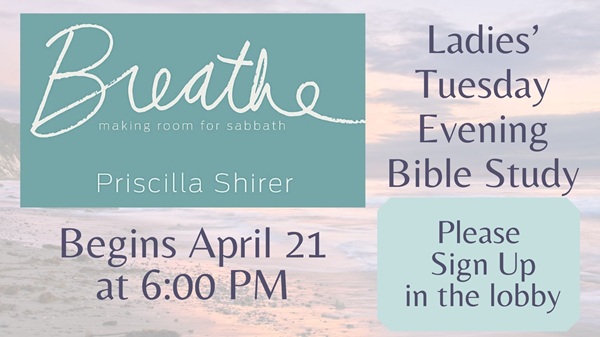 Are you weary, worn out, and exhausted? Do you feel in bondage due to the busyness in your life? The Sabbath was a gift to the Israelites and is still a gift today! Join us for our ladies’ spring Bible study, “Breathe,” by Priscilla Shirer. This is a 5-week study that will help reclaim some tranquility, serenity, and repose in your life by making room for the sabbath. Please see Lisa Sellen with questions.